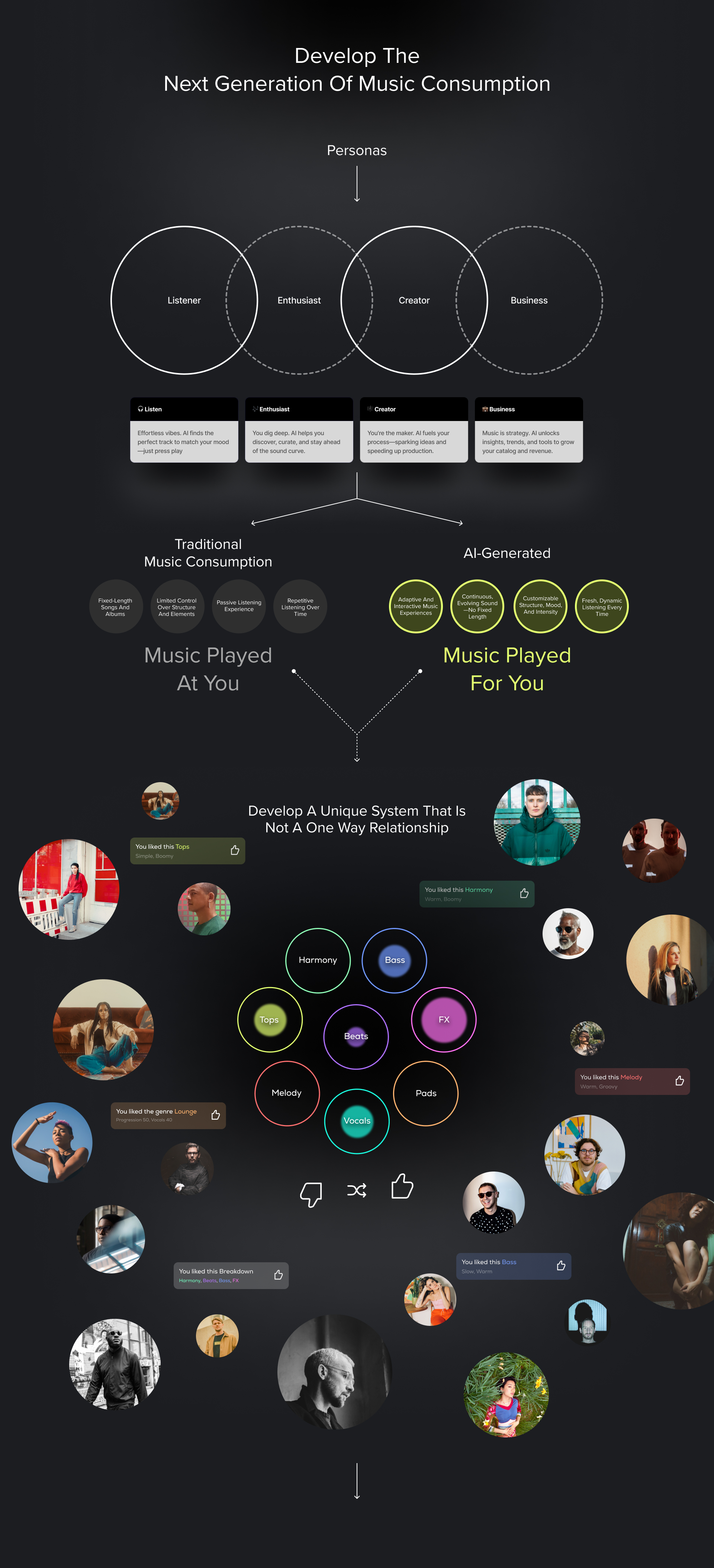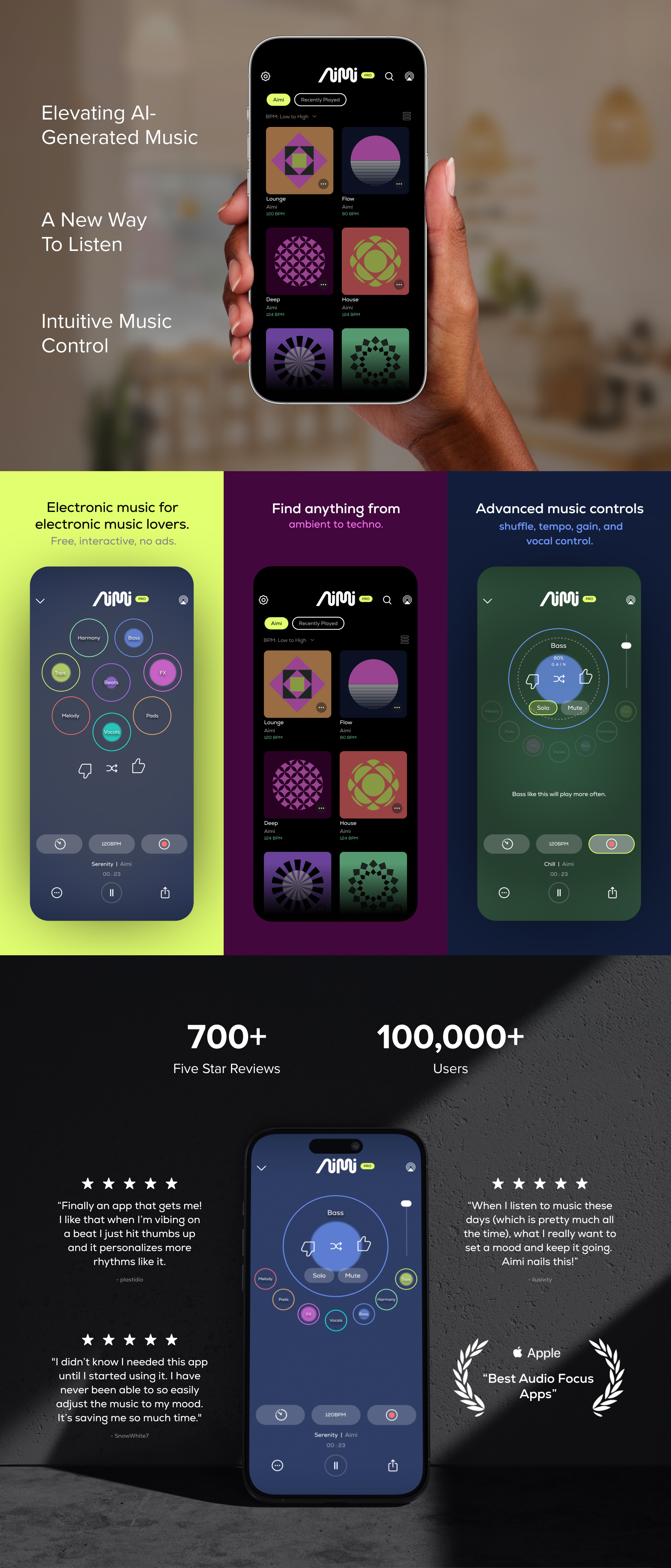As Head of Product and Design for the Aimi Player, I led the vision, strategy, and execution of a first-of-its-kind AI-powered music experience. From concept to launch, I oversaw product development, user experience, and brand integration—crafting an intuitive platform that transforms how listeners interact with generative music. Collaborating across engineering, marketing, and executive teams, I helped scale Aimi's offering into a consumer-facing product that was central to the company's $20MM+ Series B fundraise and broader shift from R&D to market-ready innovation.