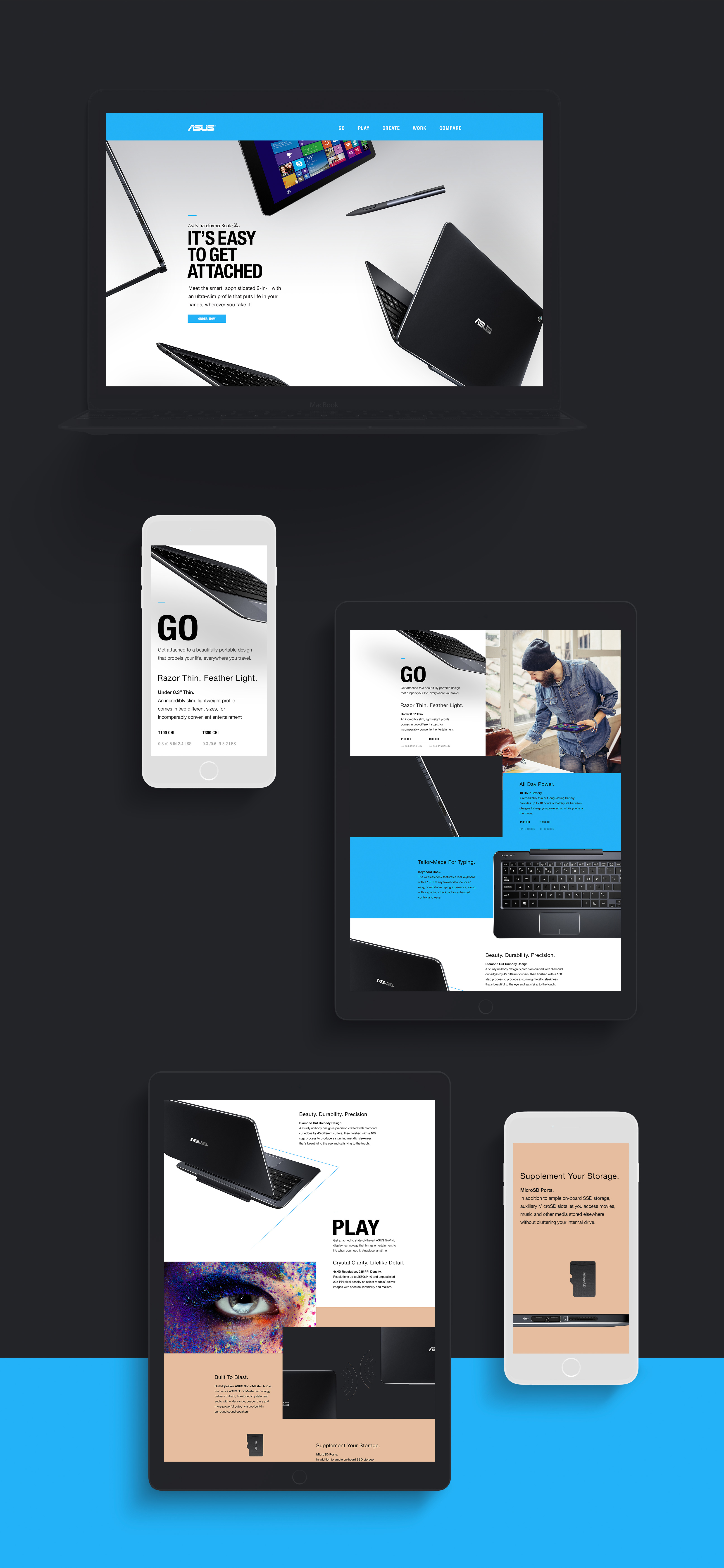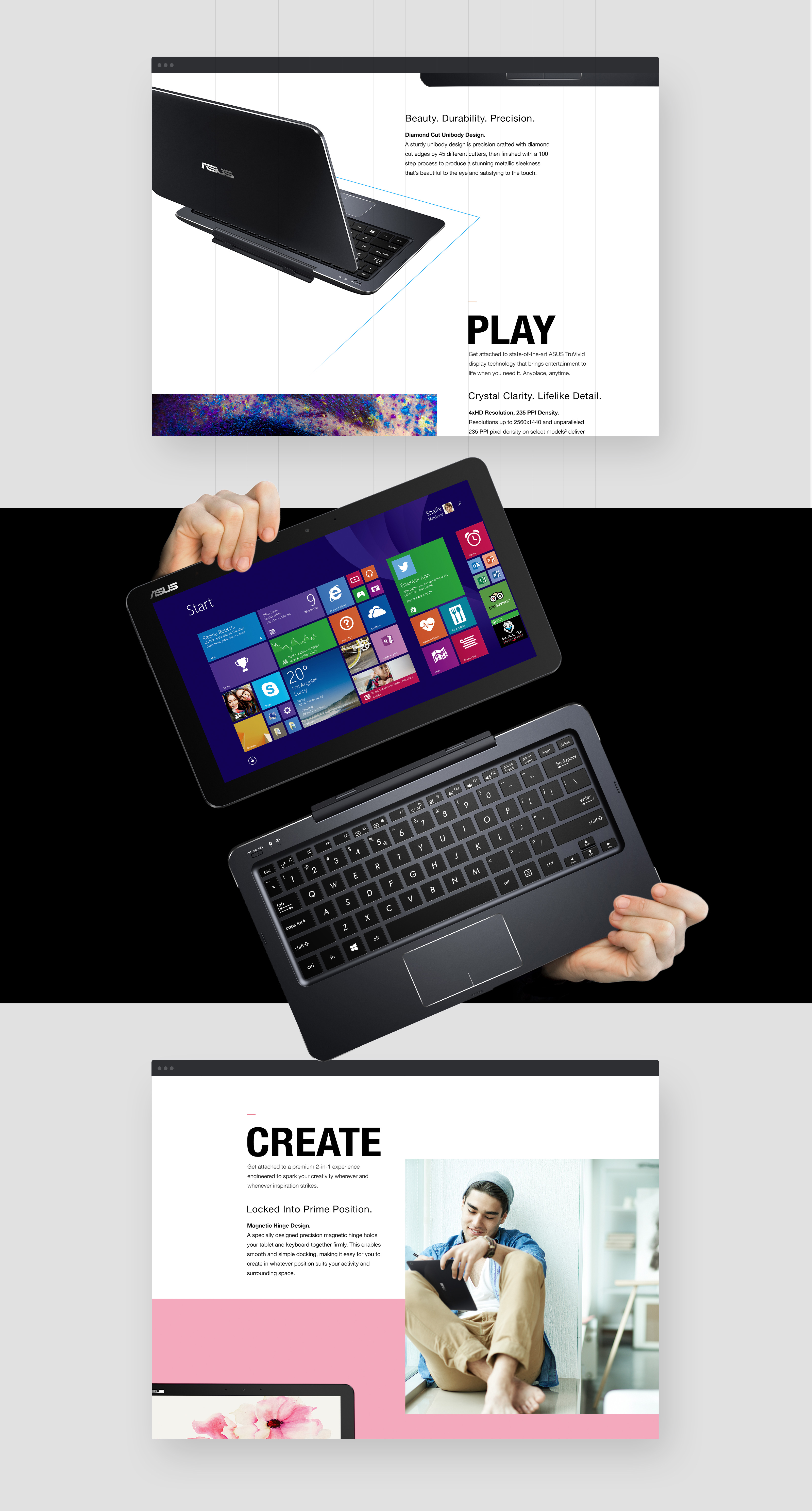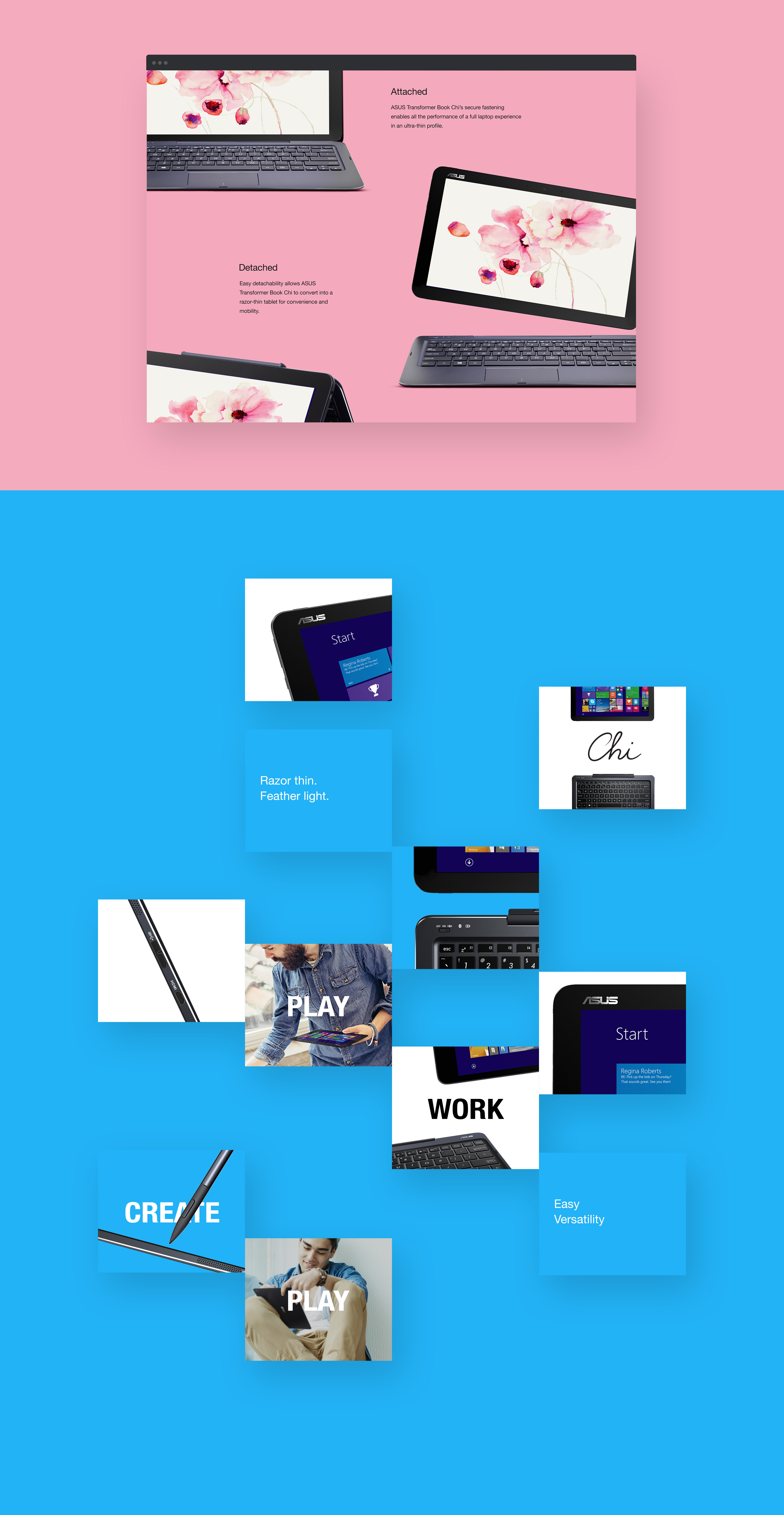 My role as XD was to lead the team and help design an elegant product landing page that illustrates the ASUS Transformer Book Chi's compelling innovations and the advantages it offers to the lifestyles of young, active, creative consumers. The content we created for this page was also repurposed and shared with digital distributors for e-commerce purposes.